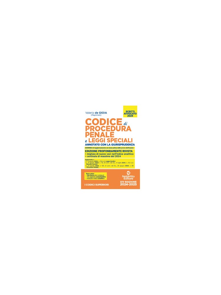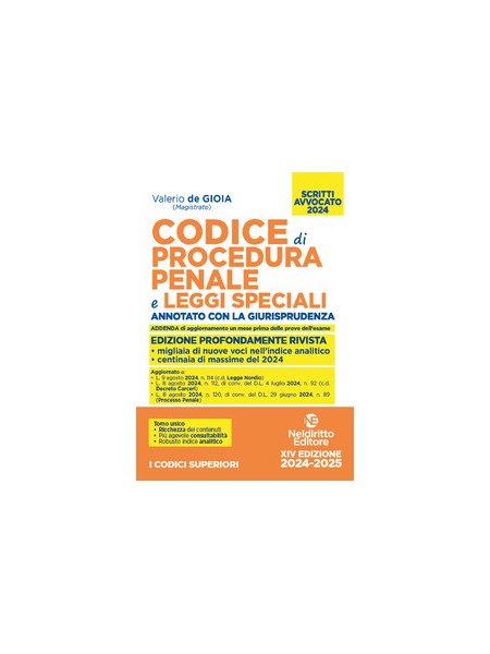 DOPO ANNI SEGNATI DAL SISTEMA DEL C.D. ORALE RAFFORZATO, E' STATA RIPRISTINATA PER L'ESAME DI STATO PER L'ABILITAZIONE ALLA PROFESSIONE DI AVVOCATO LA SESSIONE SCRITTA, CONSISTENTE NELLA REDAZIONE DI UN ATTO GIUDIZIARIO. LA PROVA ORALE, INVECE, SARA' ARTICOLATA IN PIU' FASI DI CUI LA PRIMA CONSISTE NELLA SOLUZIONE DI UN CASO. SONO DESTINATI AD ESSERE NUOVAMENTE DECISIVI, PERTANTO, I CODICI ANNOTATI CHE GARANTISCONO COMPLETEZZA, AGGIORNAMENTO, RAPIDITA' NELLA CONSULTAZIONE E NELLA RICERCA DELLE MASSIME PERTINENTI. I CODICI SUPERIORI ANNOTATI CON GIURISPRUDENZA, NELDIRITTO EDITORE - DA CIRCA 20 ANNI DIFFUSAMENTE UTILIZZATI DA PROFESSIONISTI E ASPIRANTI AVVOCATI- SONO IL RISULTATO DELL'IMPEGNO PROFUSO DA GIURISTI AUTOREVOLI. NELLE EDIZIONI 2024-2025, I CODICI, OLTRE CHE AGGIORNATISSIMI, SONO PROFONDAMENTE RIPENSATI, RIORGANIZZATI, ARRICCHITI. PARTICOLARE IMPEGNO, IN QUESTA EDIZIONE, E' STATO PROFUSO NELL'ASSICURARE: L'AGGIORNAMENTO DELL'APPARATO NORMATIVO, LA COMPLETEZZA E RICCHEZZA DELLE QUESTIONI GIURISPRUDENZIALI SEGNALATE, LA CHIAREZZA DELLE MASSIME RIPORTATE LA LOGICITA' DEI SOMMARI SOTTO LE SINGOLE DISPOSIZIONI, ORGANIZZATI IN MODO DA CONSENTIRE L'AGEVOLE INDIVIDUAZIONE DEI PROFILI ESAMINATI E L'INTUITIVA RICOSTRUZIONE DEI PERCORSI LOGICI SOTTESI LA STRUTTURA GRAFICA CHE FAVORISCE UN'AGEVOLE CONSULTAZIONE, ANCHE GRAZIE AD UN USO SAPIENTE DELLA TECNICA DEL GRASSETTO LA PARTICOLARE VISIBILITA' DELLE DECISIONI PIU' RECENTI E DI QUELLE DEGLI ORGANI NOMOFILATTICI IL PUNTUALE AGGIORNAMENTO ALLA GIURISPRUDENZA PIU' RECENTE, ANCHE DI MERITO. IN QUESTA EDIZIONE SONO STATE INSERITE NUMEROSISSIME MASSIME DEL 2024. E' STATO, INFINE, REALIZZATO EX NOVO L'INDICE ANALITICO. TANTO PER IL PROFESSIONISTA QUANTO PER CHI DEVE SOSTENERE LE PROVE DELL'ESAME DI ABILITAZIONE FORENSE E' FONDAMENTALE POTER INDIVIDUARE TEMPESTIVAMENTE LE MASSIME CHE AFFRONTANO GLI ASPETTI DI DIRITTO DECISIVI PER LA SOLUZIONE DEL CASO. IN QUESTA PROSPETTIVA, L'INDICE E' STATO ARRICCHITO CON MIGLIAIA DI