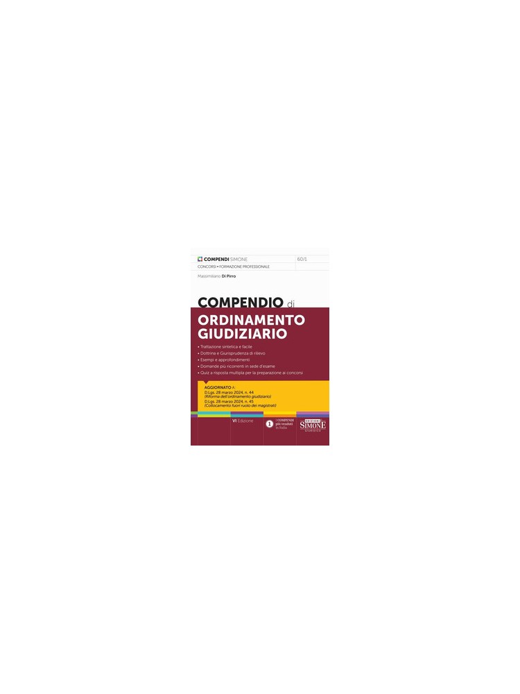 La nuova edizione del Compendio di Ordinamento giudiziario esce aggiornata all’attuazione della legge delega n. 71/2022 e ai conseguenti D.Lgs. 28-3-2024, n. 44, sulla revisione dell’assetto ordinamentale della magistratura, e D.Lgs. 28-3-2024, n. 45 sul riordino della disciplina del collocamento fuori ruolo dei magistrati ordinari, amministrativi e contabili. L’articolata riforma dell’ordinamento giudiziario ha reso necessario proporre questa edizione del compendio in una veste totalmente rifondata, soprattutto funzionale alle esigenze di coloro che devono preparare i concorsi nonchè operatori del diritto. Il testo analizza i vari tipi di giurisdizione e i principi costituzionali che regolano l’attività giurisdizionale si esaminano gli aspetti organizzativi degli uffici giudiziari in materia di tabelle, applicazioni e supplenze, dando risalto agli Uffici della Procura della Repubblica, ai quali è dedicato un capitolo ad hoc per la complessità degli snodi organizzativi e delle attività svolte. Si passa quindi al sistema di autogoverno della magistratura, affidato al CSM, analizzato in generale e nei suoi rapporti con il potere politico. A questi aspetti, si affiancano quelli in materia di accesso, tirocinio e formazione dei magistrati (affidata alla Scuola superiore della magistratura), di carriera dei magistrati ordinari (compresi l’orario di lavoro, le ferie, il congedo, le aspettative e il collocamento a riposo) e di trasferimenti d’ufficio e incompatibilità. Sono altresì approfonditi i profili procedurali e sanzionatori annessi alla responsabilità civile e disciplinare. Seguono i capitoli relativi alla magistratura onoraria, ai cancellieri e ufficiali giudiziari, e, infine, alla mediazione finalizzata alla conciliazione. Ogni capitolo è corredato da domande a risposta aperta che consentono di valutare il livello di preparazione raggiunto. Sempre organizzati per capitoli, sono proposti anche questionari con quiz a risposta multipla utili per la preparazione ai concorsi. In Appendice, infine, è riportato il testo del R.D. 30-1-1941, n. 12 che disciplina l’Ordinamento giudiziario, aggiornato alle ultime modifiche normative di marzo 2024.
