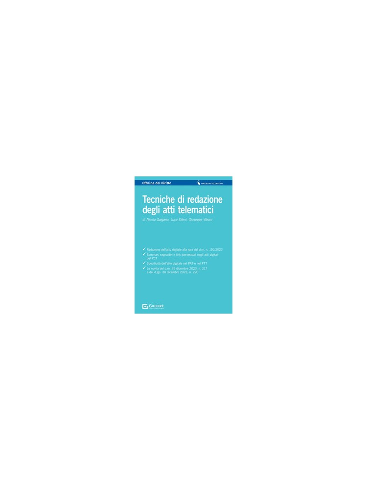L'OFFICINA SULLE "TECNICHE DI REDAZIONE DEGLI ATTI TELEMATICI" OFFRE UNA PANORAMICA DETTAGLIATA DELLE PIU' EFFICACI TECNICHE E MODALITA' DI SCRITTURA DEGLI ATTI GIUDIZIARI REDATTI IN FORMA DIGITALE E DESTINATI AL DEPOSITO TELEMATICA. IL CUORE DELLA TRATTAZIONE E' CERTAMENTE L'ANALISI DEL DECRETO N. 110 DEL MINISTRO DELLA GIUSTIZIA, PUBBLICATO IL 11 AGOSTO 2023 NELLA GAZZETTA UFFICIALE N. 187, CHE, COME NOTO, MIRA A FORNIRE LINEE GUIDA DETTAGLIATE PER LA COMPILAZIONE DEGLI ATTI PROCESSUALI DA PARTE DEGLI AVVOCATI. IL REGOLAMENTO SI APPLICA ALLE CAUSE DI VALORE INFERIORE A 500.000 EURO E DEFINISCE GLI ATTI PROCESSUALI SOGGETTI AI CRITERI DI REDAZIONE. SECONDO L'ARTICOLO 2 DEL DECRETO, QUESTI ATTI INCLUDONO CITAZIONI, RICORSI, COMPARSE DI RISPOSTA, MEMORIE DIFENSIVE, CONTRORICORSI E ATTI DI INTERVENTO. INOLTRE, SE COMPATIBILI, I CRITERI SI ESTENDONO AD ALTRI ATTI DEL PROCESSO. OBIETTIVO DEL VOLUME E' FORNIRE UNA CHIARA COMPRENSIONE DEI LIMITI DIMENSIONALI DEGLI ATTI PROCESSUALI, CHE VARIANO A SECONDA DEL TIPO DI ATTO (AD ESEMPIO, GLI ATTI DI CITAZIONE E RICORSO HANNO UN LIMITE MASSIMO DI 80.000 CARATTERI) MA CHE NON COMPRENDONO ALCUNE PARTI DEGLI SCRITTI DIFENSIVI, COME AD ESEMPIO L'INDICE, LA SINTESI, LE INDICAZIONI PREVISTE DALLA LEGGE, LA DATA E IL LUOGO, LE SOTTOSCRIZIONI DELLE PARTI E DEI DIFENSORI, LE RELAZIONI DI NOTIFICA E I RIFERIMENTI GIURISPRUDENZIALI. IL LIBRO ESAMINA INOLTRE IN DETTAGLIO I CRITERI CHE GLI AVVOCATI DEVONO SEGUIRE NELLA REDAZIONE DEI SUDDETTI ATTI. QUESTI CRITERI INCLUDONO L'INTESTAZIONE DELL'ATTO, L'INDICAZIONE DELLE PARTI COINVOLTE, LE PAROLE CHIAVE CHE IDENTIFICANO L'OGGETTO DEL GIUDIZIO, L'INDICAZIONE DEGLI ESTREMI DEL PROVVEDIMENTO IMPUGNATO, L'ESPOSIZIONE DEI FATTI E DEI MOTIVI DI DIRITTO, L'INDICAZIONE DEI MEZZI DI PROVA E L'INDICE DEI DOCUMENTI PRODOTTI, LE CONCLUSIONI E ALTRO ANCORA. QUESTA PARTE DEL TESTO, VA NOTATO, E' PARTICOLARMENTE IMPORTANTE PERCHE' COSTITUISCE APPLICAZIONE DIRETTA DEI PRINCIPI DI CUI ALL'ART. 121 C.P.C. E DET