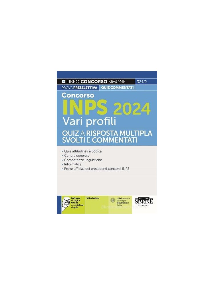 | Titolo | CONCORSO INPS 2024 VARI PROFILI QUIZ A RISP MULTIPLA SVOLTI E COMMENTATI |