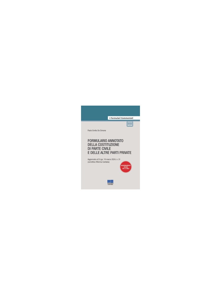 Titolo | FORMULARIO ANNOTATO DELLA COSTITUZIONE DI PARTE CIVILE E DELLE ALTRE PARTI PRIVATE. AGGIORNATO A... |